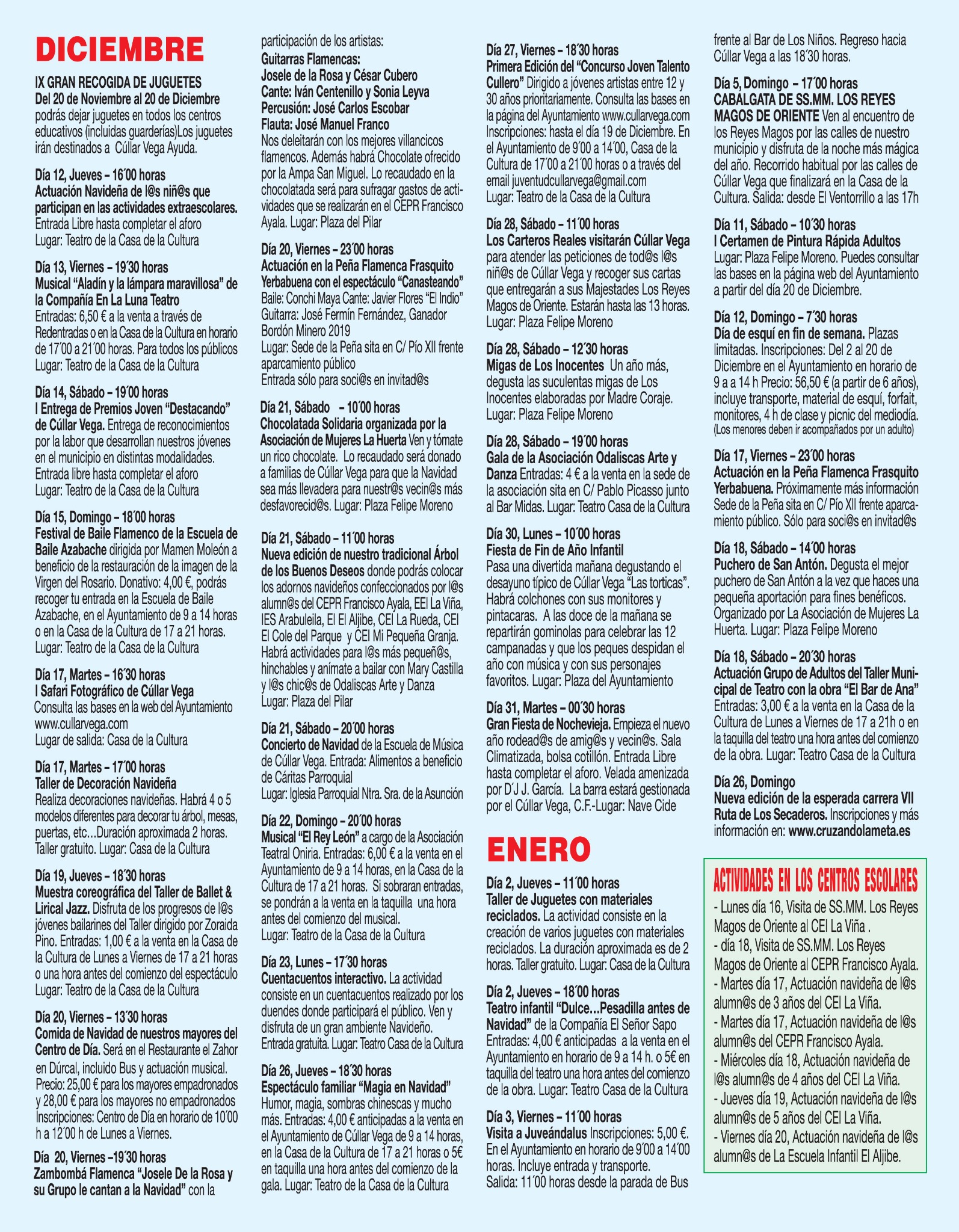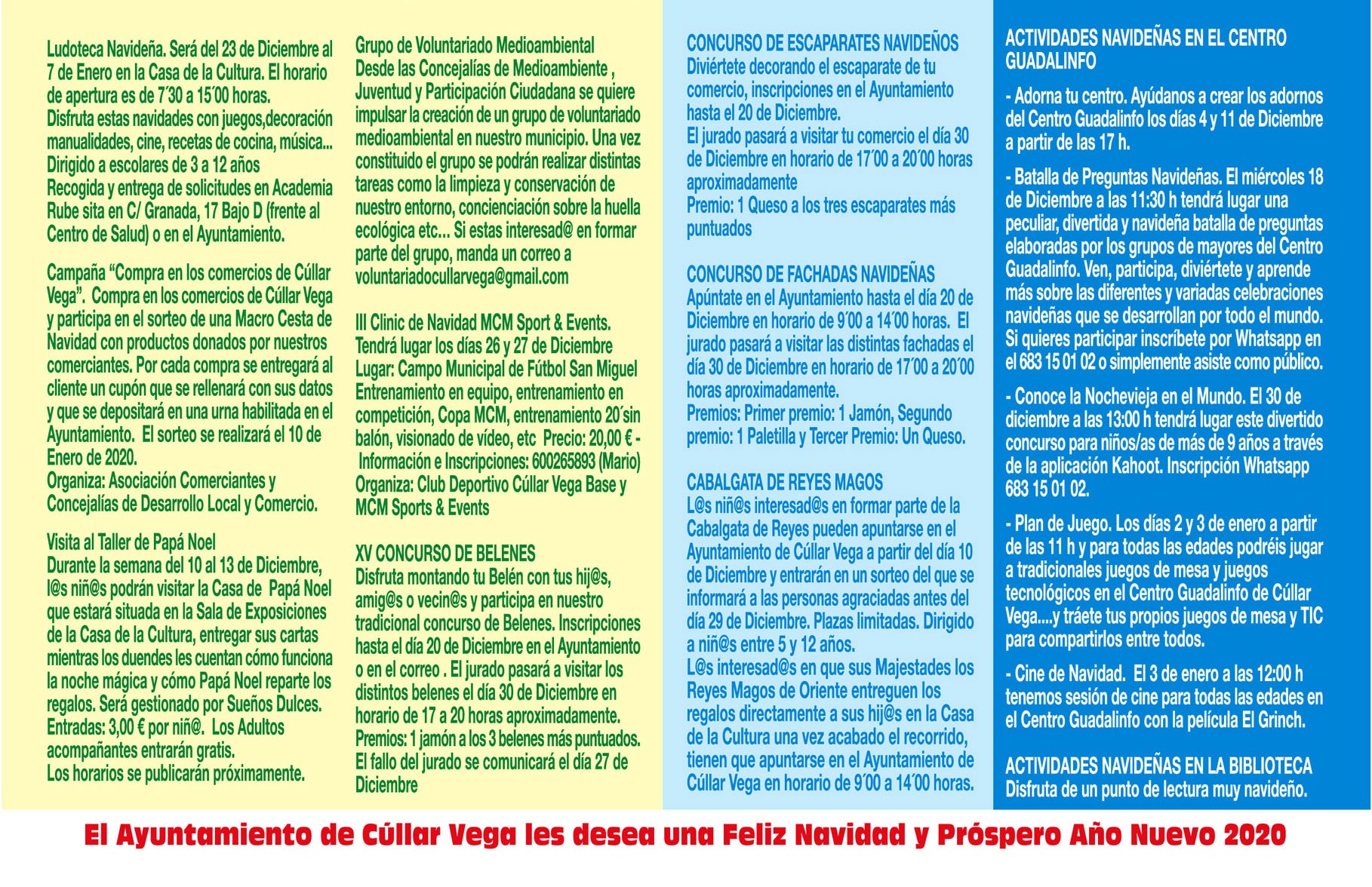 Ya tenéis disponible el Programa de Actividades para la Navidad 2019-2020 que se desarrollarán en las próximas semanas en Cúllar Vega. Actividades preparadas con mucha ilusión y trabajo por la Concejalía de Cultura y Juventud del Ayuntamiento de Cúllar Vega con la colaboración de muchas personas y colectivos del municipio.