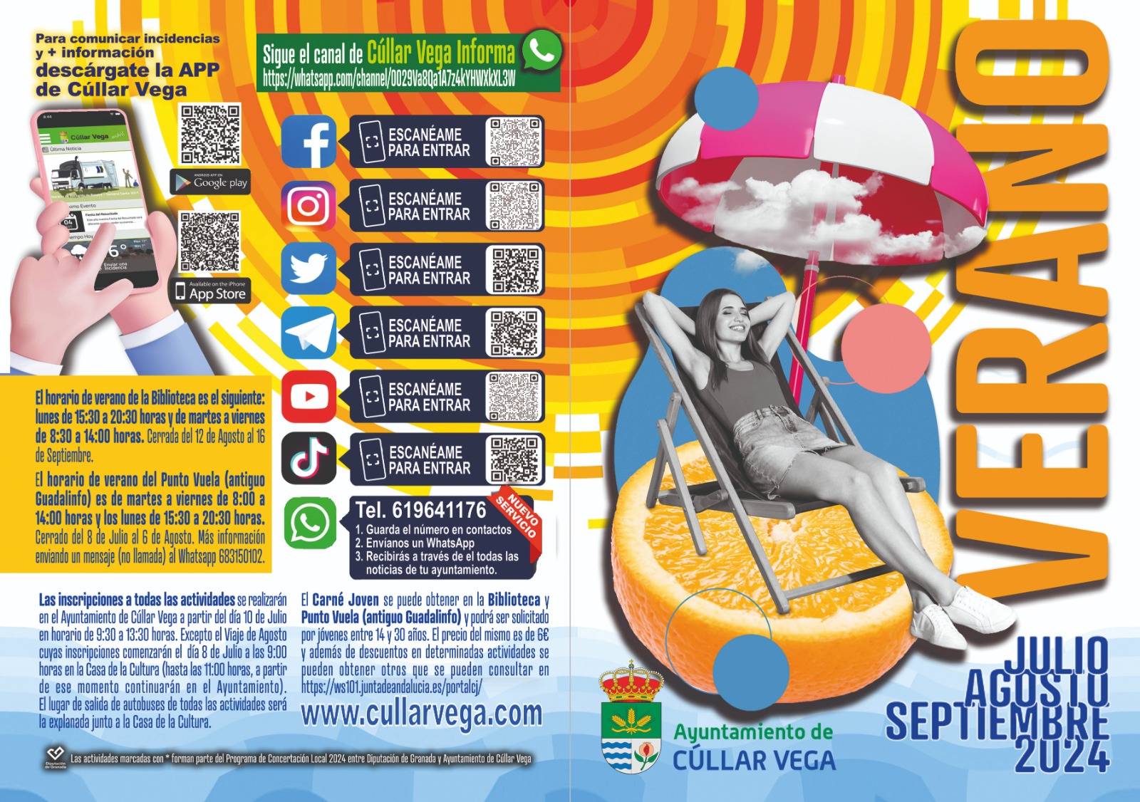 Las inscripciones a todas las actividades se realizarán en el Ayuntamiento de Cúllar Vega a partir del día 10 de Julio en horario de 9´30 a 13´30 horas. Excepto el Viaje de Agosto cuyas inscripciones comenzará en día 8 de Julio a las 9 h. en la Casa de la Cultura (hasta las 11 h., a partir de ese momento continuarán en el ayuntamiento).