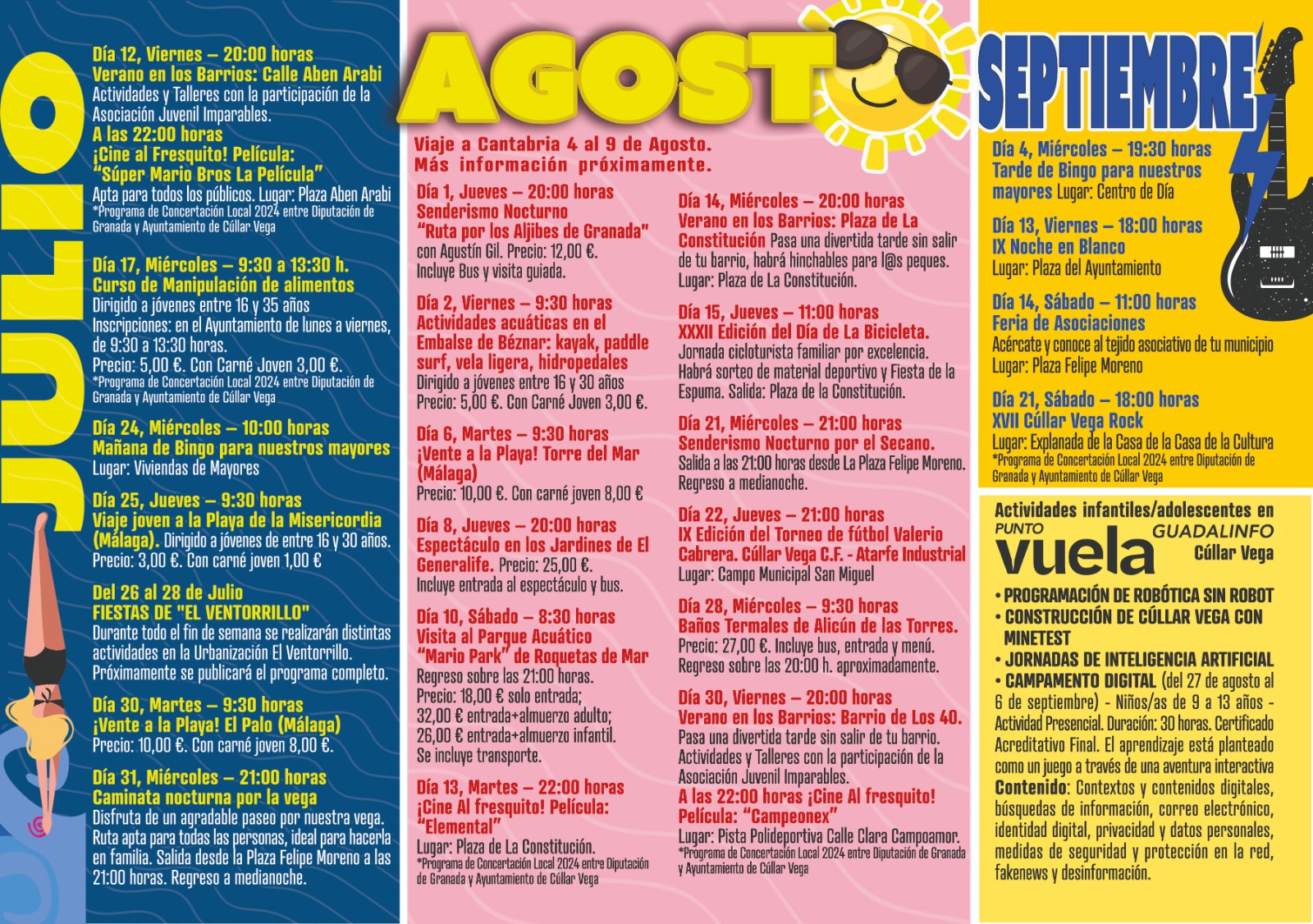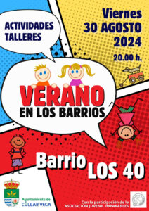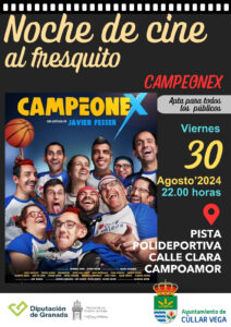 Día 30, Viernes – 20 h. – VERANO EN LOS BARRIOS: BARRIO DE LOS 40 – Pasa una divertida tarde sin salir de tu barrio. Actividades y Talleres con la participación de la Asociación Juvenil Imparables. A las 22 h. ¡Cine Al fresquito! Película: “Campeonex” Lugar: Pista Polideportiva Calle Clara Campoamor. «Programa de Concertación Local 2024 entre Diputación de Granada y Ayto de Cúllar Vega»