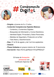 – CAMPAMENTO DIGITAL: (del 27 de agosto al 6 de septiembre) – Niños/as de 9 a 13 años – Actividad Presencial. Duración: 30 horas. Certificado Acreditativo Final. El aprendizaje está planteado como un juego a través de una aventura interactiva – Contenido: Contextos y contenidos digitales, búsquedas de información, correo electrónico, identidad digital, privacidad y datos personales, medidas de seguridad y protección en la red, fake news y desinformación.