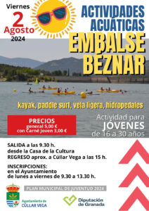 Día 2, Viernes – 9´30 h. – ACTIVIDADES ACUÁTICAS EN EL PANTANO DE BÉZNAR (kayakm paddle, surf, vela ligera, hidropedales) – Dirigido a jóvenes entre 16 y 30 años. Precio: 5 € (con carné joven 3 €). Programa 2403_2024 PLan Municipal de Juventud en concertación con Diputación de Granada.