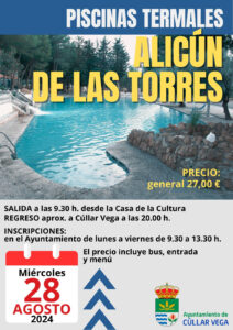 Día 28, Miércoles – 9 h. – BAÑOS TERMALES DE ALICÚN DE LAS TORRES – Precio: 27 €. Incluye bus, entrada y menú. Regreso sobre las 20 h. aproximadamente.
