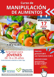 Día 17, Miércoles – 10 h. – CURSO DE MANIPULACIÓN DE ALIMENTOS. Dirigido a jóvenes entre 16 y 35 años – Inscripciones: en el ayuntamiento de lunes a viernes de 09:30 a 13:30 h. Precio: 5 € (con carné joven: 3 €.) «Programa de Concertación Local 2024 entre Diputación de Granada y Ayto de Cúllar Vega»