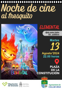 Día 13, Martes – 22 h. – ¡CINE AL FRESQUITO! “ELEMENTAL” – Lugar: Plaza de La Constitución. «Programa de Concertación Local 2024 entre Diputación de Granada y Ayto de Cúllar Vega»