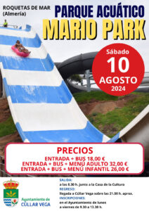 Día 10, Sábado – 8´30 h. – VISITA AL PARQUE ACUÁTICO «MARIO PARK» de Roquetas de Mar. Regreso sobre las 21 h.. Precio: 18 € solo entrada (32 € entrada + almuerzo adulto – 26 € entrada + almuerzo infantil) . Se Incluye transporte.