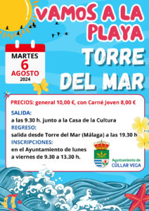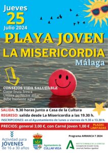 Día 25, Jueves – 9´30 h. – VIAJE JOVEN A LA PLAYA DE LA MISERICORDIA (Málaga) – Dirigido a jóvenes de entre 16 y 30 años. Precio: 3 € (con carné joven: 1 €)