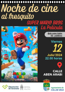 Día 12, Viernes – 20 h. – VERANO EN LOS BARRIOS: CALLE ABEN ARABI: actividades y talleres con la participación de la Asociación Juvenil Imparables. A las 22 h. ¡Cine al Fresquito! Película: “SUPER MARIO BROS – LA PELÍCULA”. Apta para todos los públicos. Lugar: Plaza Aben Arabi. «Programa de Concertación Local 2024 entre Diputación de Granada y Ayto de Cúllar Vega»