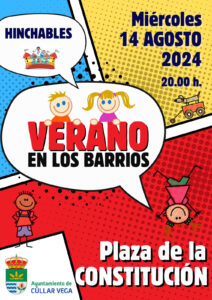 Día 14, Miércoles – 20 h. – VERANO EN LOS BARRIOS: PLAZA DE LA CONSTITUCIÓN – Pasa una divertida tarde sin salir de tu barrio, habrá hinchables para l@s peques. Lugar: Plaza de La Constitución.