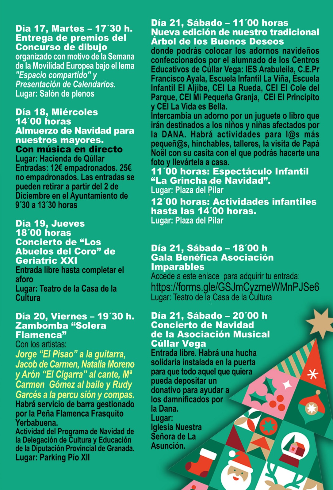 Día 21 de diciembre, Sábado – 20´00 horas: CONCIERTO DE NAVIDAD de la Asociación Musical Cúllar Vega. Entradas libre. Habrá una hucha solidaria instalada en la puerta para que todo aquel que quiera pueda depositar un donativo para ayudar a los damnificados por la DANA. Lugar: Iglesia Nuestra Señora de La Asunción.