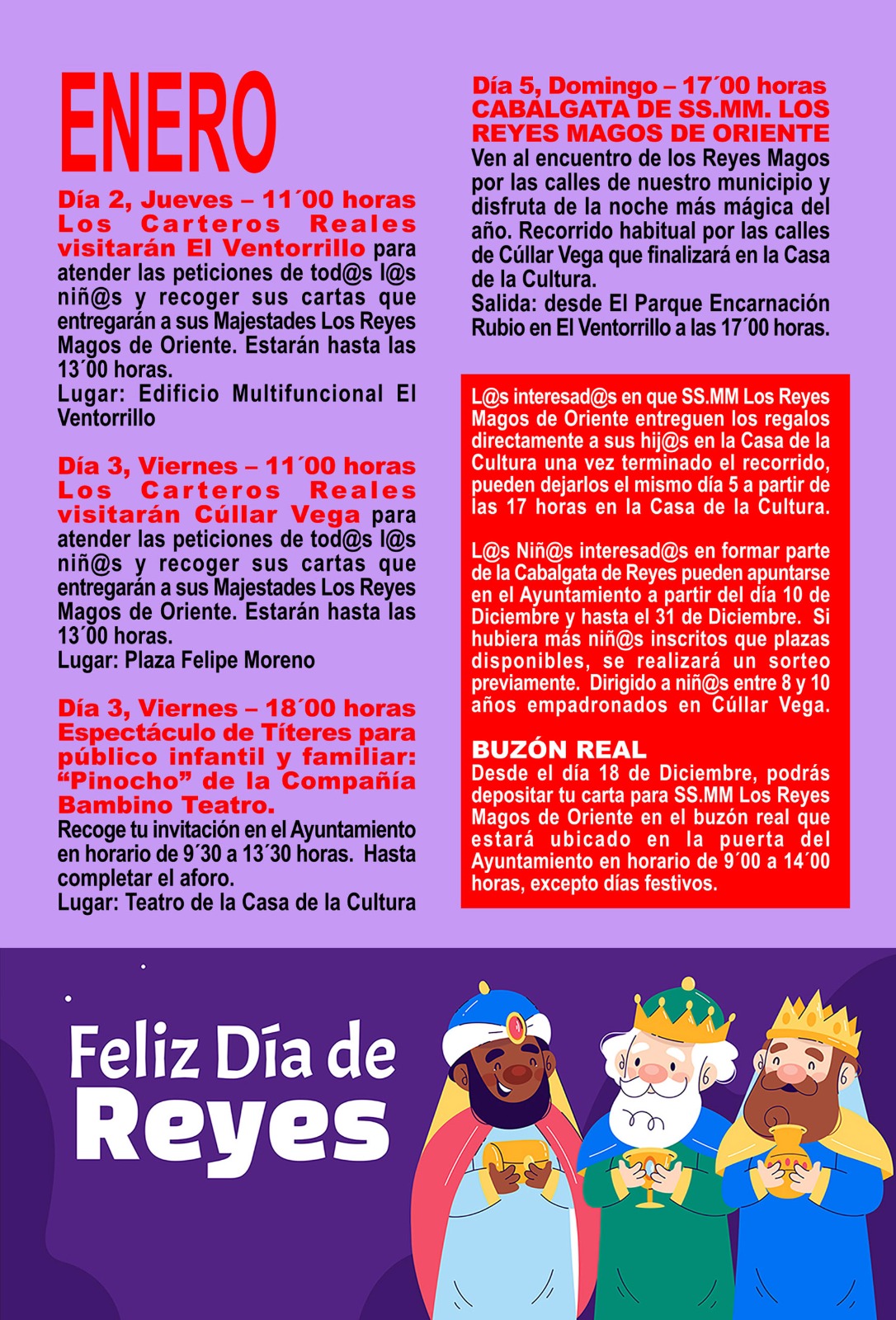 Día 5 de enero, Domingo – 17´00 horas: CABALGATA DE SS.MM. LOS REYES MAGOS DE ORIENTE. Ven al encuentro de los Reyes Magos por las calles de nuestro municipio y disfruta de la noche más mágica del año. Recorrido habitual por las calles de Cúllar Vega que finalizará en la Casa de la Cultura. Salida: desde El Parque Encarnación Rubio en El Ventorrillo a las 17´00 horas.