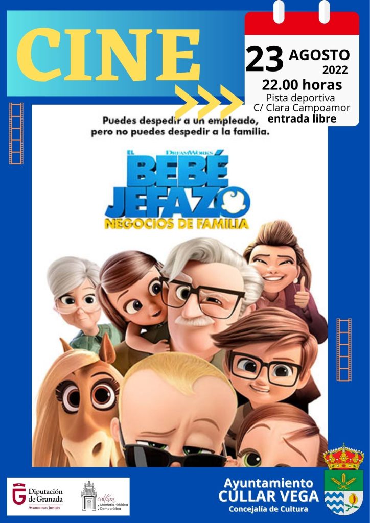 – Día 23, Martes – 22’00 horas ¡Cine al Fresquito! Película: «Bebé jefazo, Negocios de familia» Apta para todos los públicos Lugar: Pista polideportiva de la Calle Clara Campoamor (Los 40). Actividad dentro del Programa de Concertación Local 2022 – Diputación de Granada. *