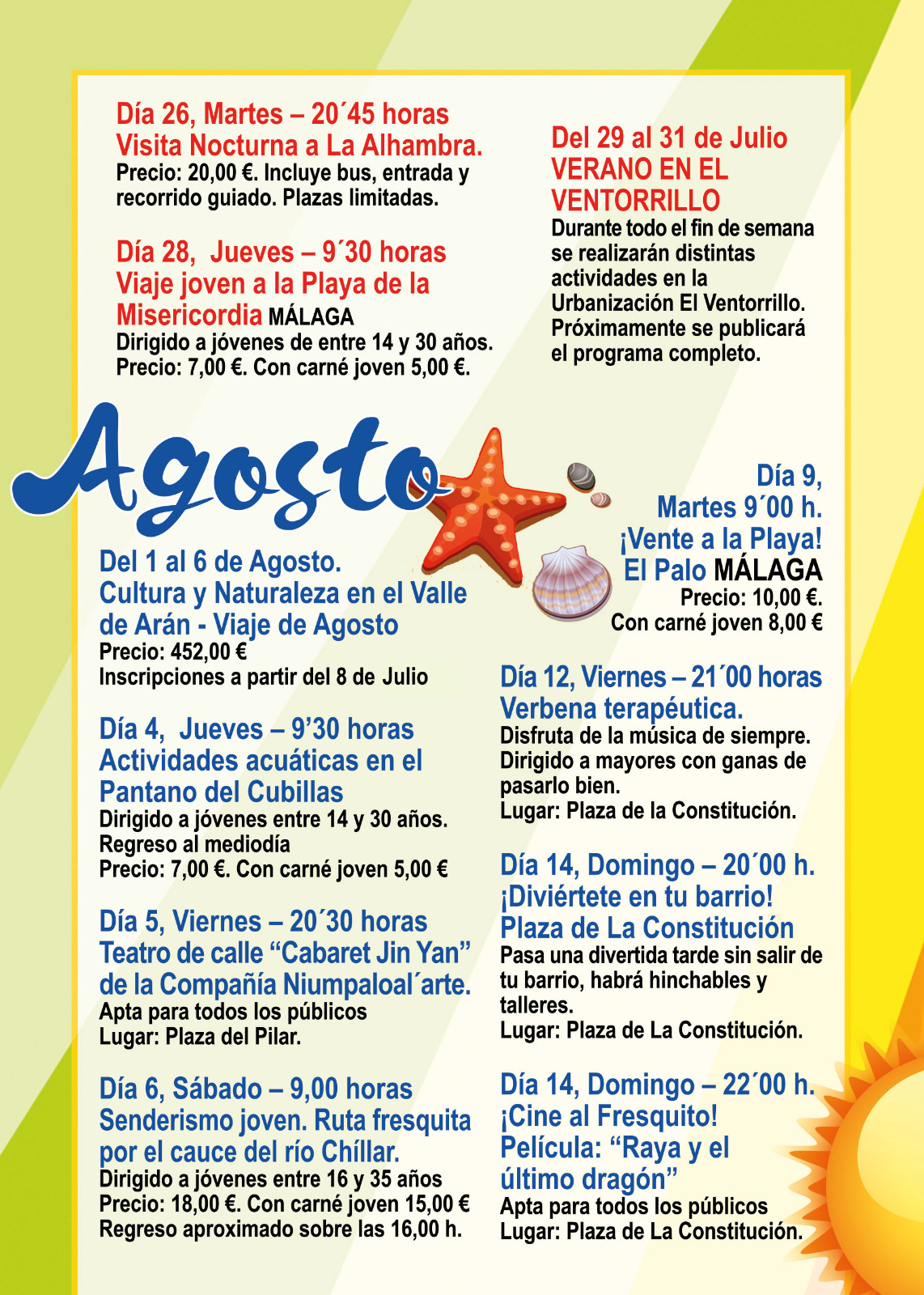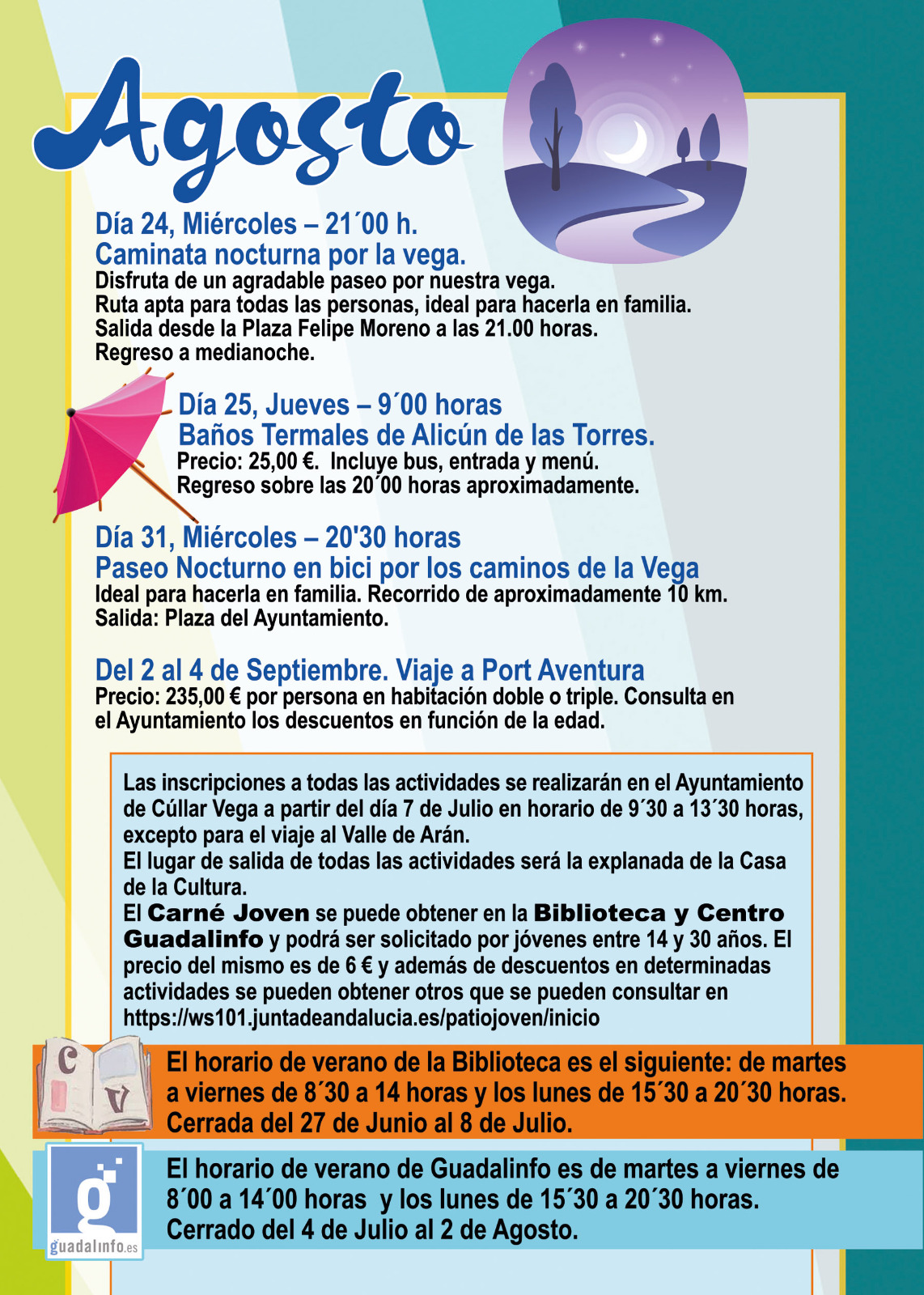 Las inscripciones a todas las actividades se realizarán en el Ayuntamiento de Cúllar Vega a partir del día 7 de Julio en horario de 9’30 a 13’30 horas, excepto para el viaje al Valle de Arán.