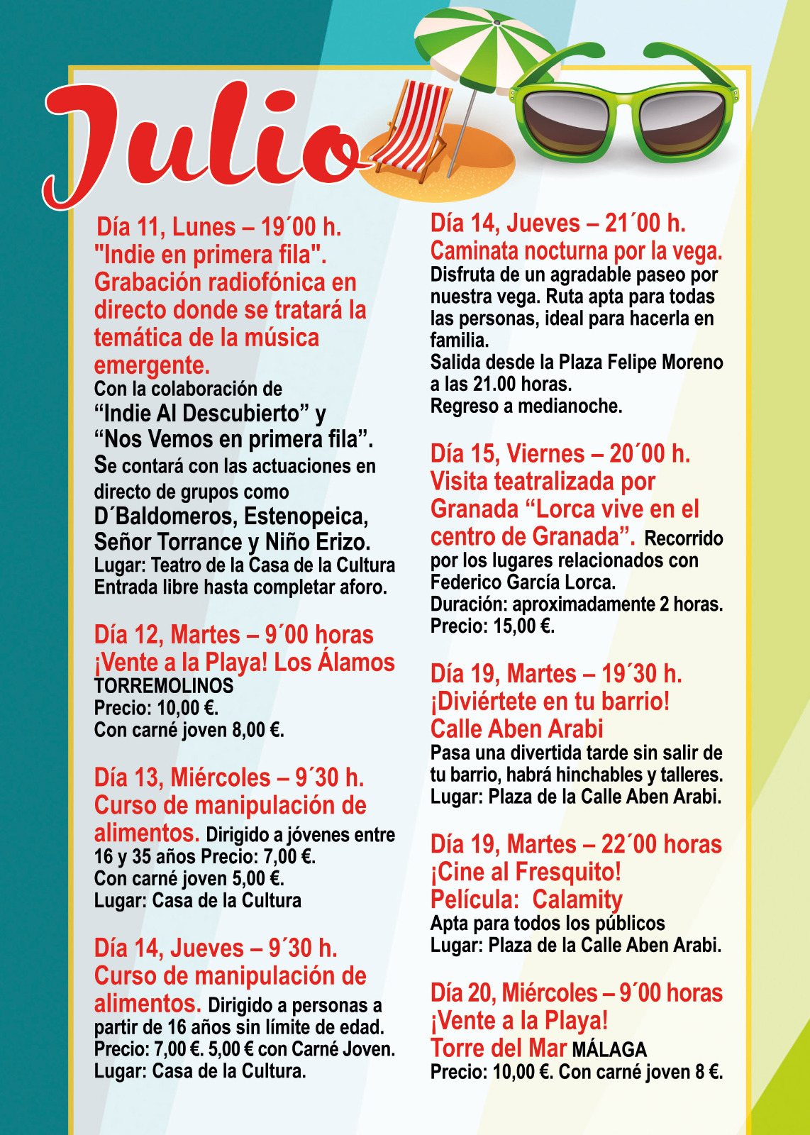 – Día 14, Jueves – 9’30 h. Curso de manipulación de alimentos. Dirigido a personas a partir de 16 años sin límite de edad. Precio: 7,00 €. 5,00€ con Carné Joven. Lugar: Casa de la Cultura.