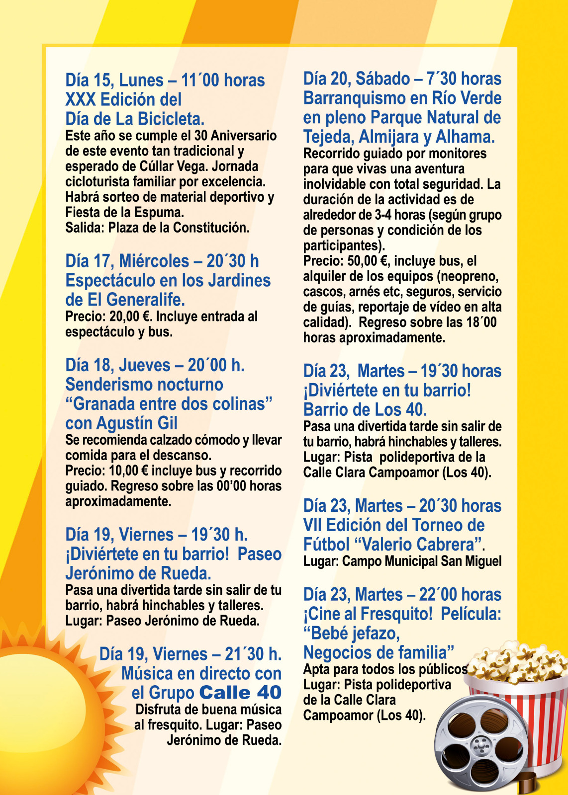 – Día 15, Lunes 11’00 horas XXX Edición del Día de La Bicicleta. Este año se cumple el 30 Aniversario de este evento tan tradicional y esperado de Cúllar Vega. Jornada cicloturista familiar por excelencia. Habrá sorteo de material deportivo y Fiesta de la Espuma. Salida: Plaza de la Constitución.