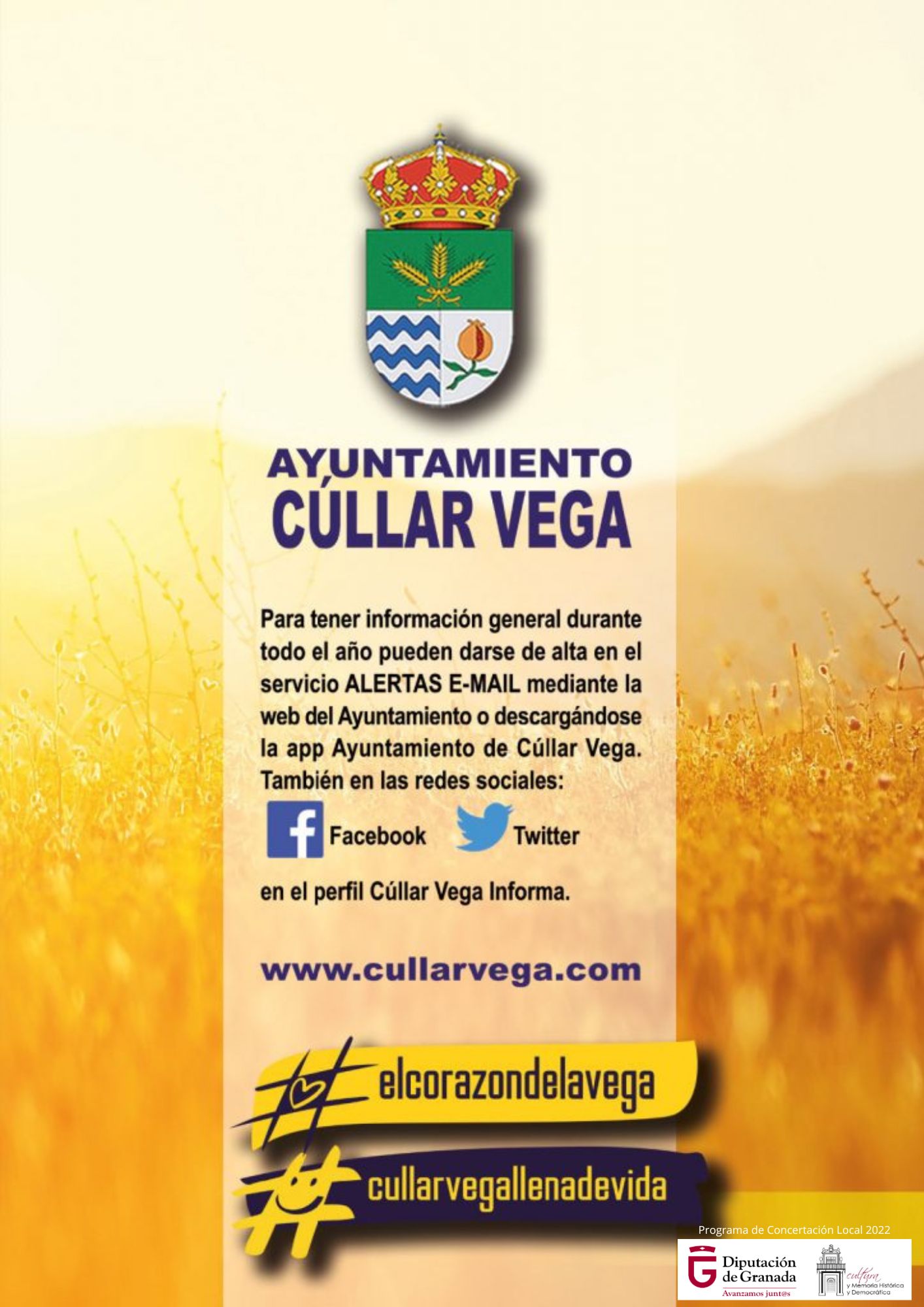 Para tener información general durante todo el año pueden darse de alta en el servicio ALERTAS E-MAIL mediante la web del Ayuntamiento o descargándose la app Ayuntamiento de Cúllar Vega. También en las redes sociales: Facebook, Twitter, Telegram