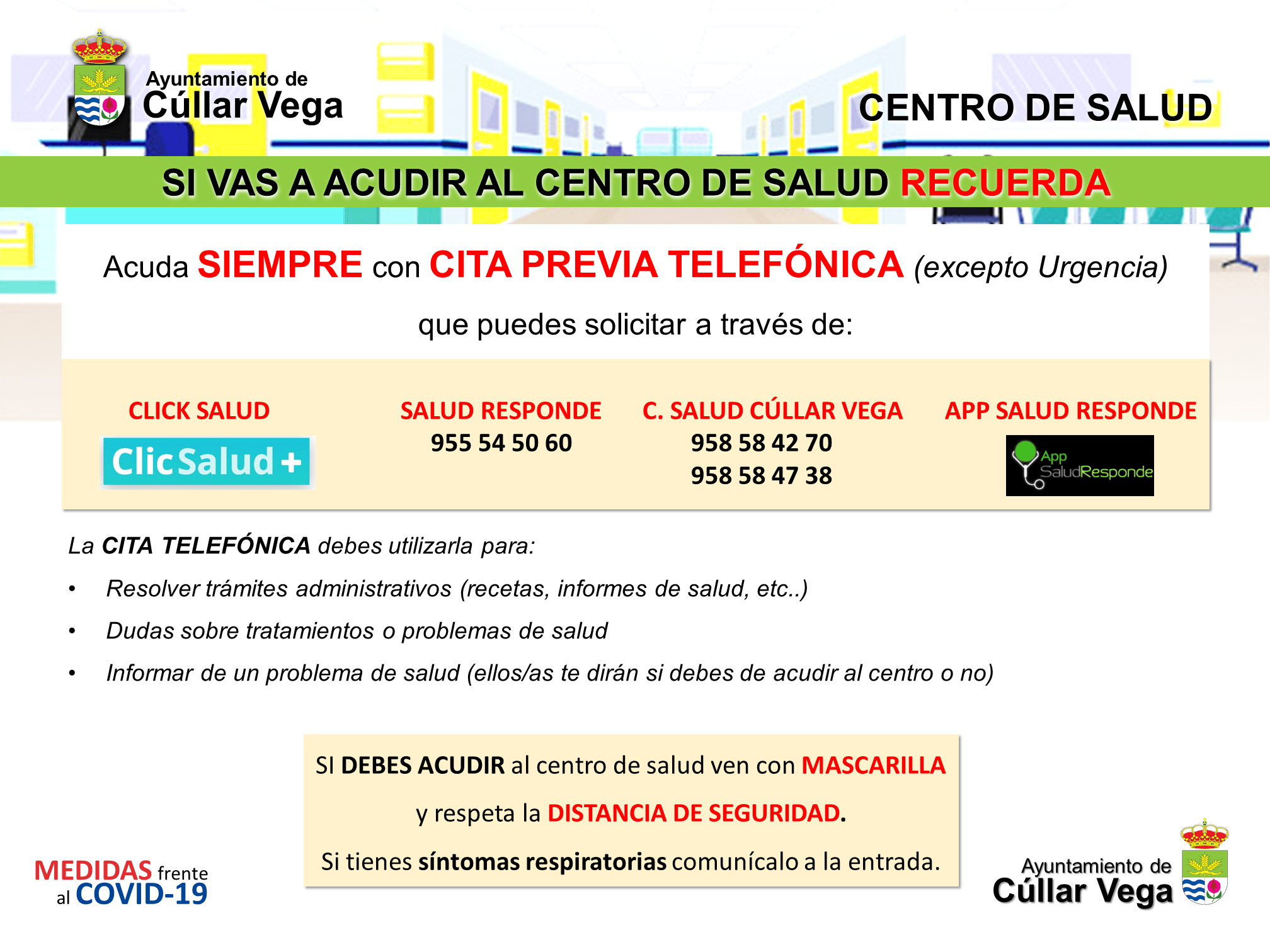 SI DEBES ACUDIR al centro de salud ven con MASCARILLA y respeta la DISTANCIA DE SEGURIDAD y si tienes síntomas respiratorias comunícalo a la entrada.