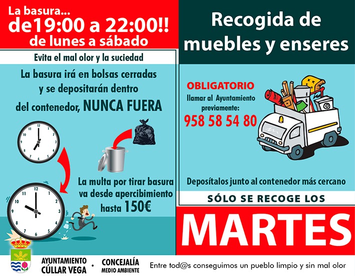 📢 Desde la Concejalía de Medio Ambiente del Ayuntamiento de Cullar Vega, con el objetivo de mejorar la eficiencia del sistema de recogida, se recomienda depositar los residuos en los HORARIOS establecidos para evitar malos olores provocados por la degradación de los alimentos.