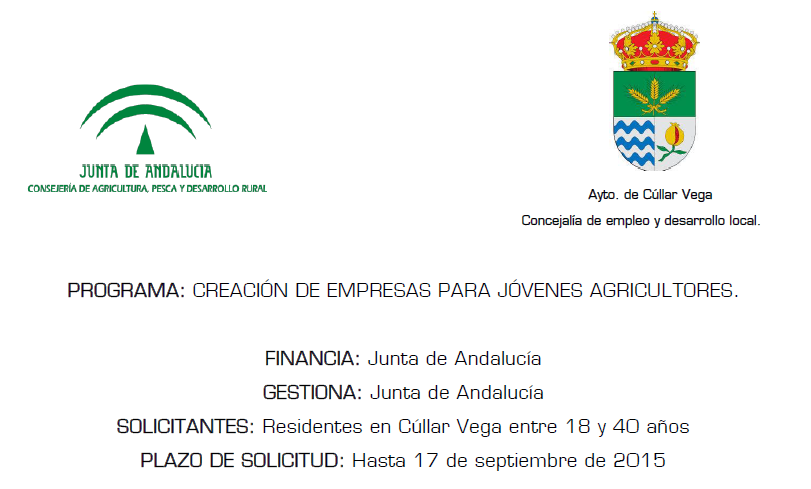 La Junta de Andalucía ofrece subvenciones para nuevas explotaciones agrarias/ganaderas. Toda la información en la Oficina de Empleo y Desarrollo Local del Ayuntamiento de Cúllar Vega (Edificio CIDE). Plazo de solicitudes hasta el 17 de Septiembre.