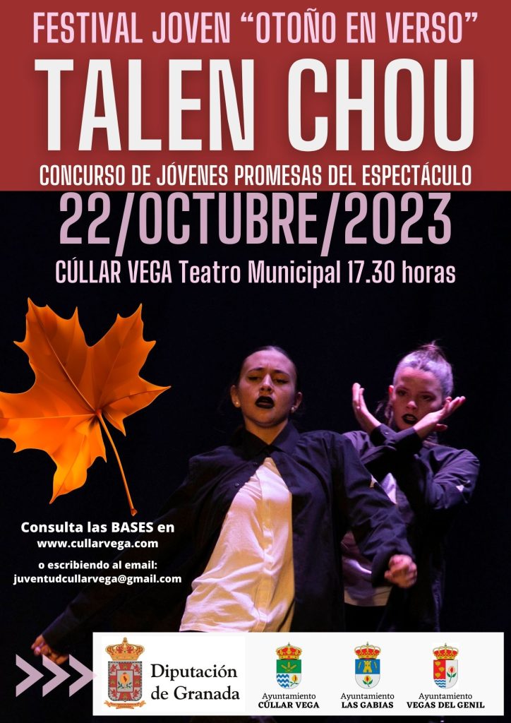 Diputación de Granada y los Ayuntamientos de Cúllar Vega, Las Gabias y Vegas del Genil convocan el Concurso “TALEN CHOU – jóvenes promesas del espectáculo” dentro de la programación del Festival Joven “Otoño en Verso 2023”, con arreglo a las siguientes BASES: