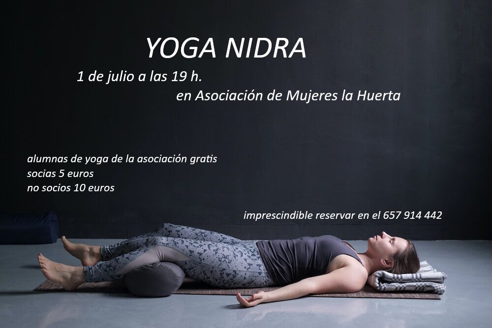 – TALLER YOGA NIDRA: Martes 1 de julio a las 19.00 h. Lugar: Sede de la Asociación de Mujeres «La Huerta» (C/ San Isidro s/n). Gratis para alumnas de yoga de la Asociación. Resto de socias: 5€. No socias: 10€. Inscripciones en el teléfono: 657914442