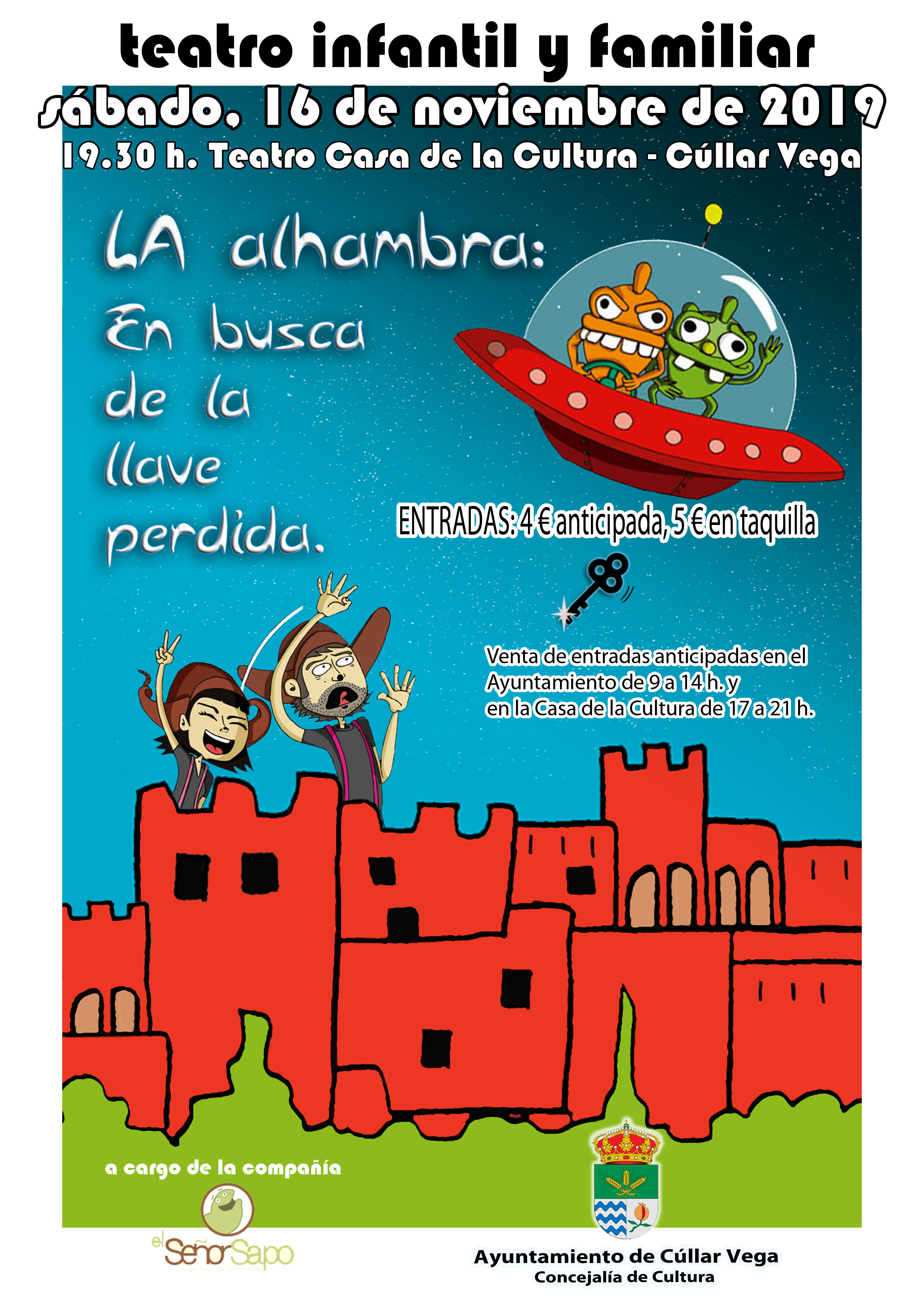 El Sábado 16 de Noviembre a las 19´30 horas tendrá lugar el Teatro Infantil “La Alhambra: En busca de la llave perdida” de la Compañía de Teatro El Señor Sapo.