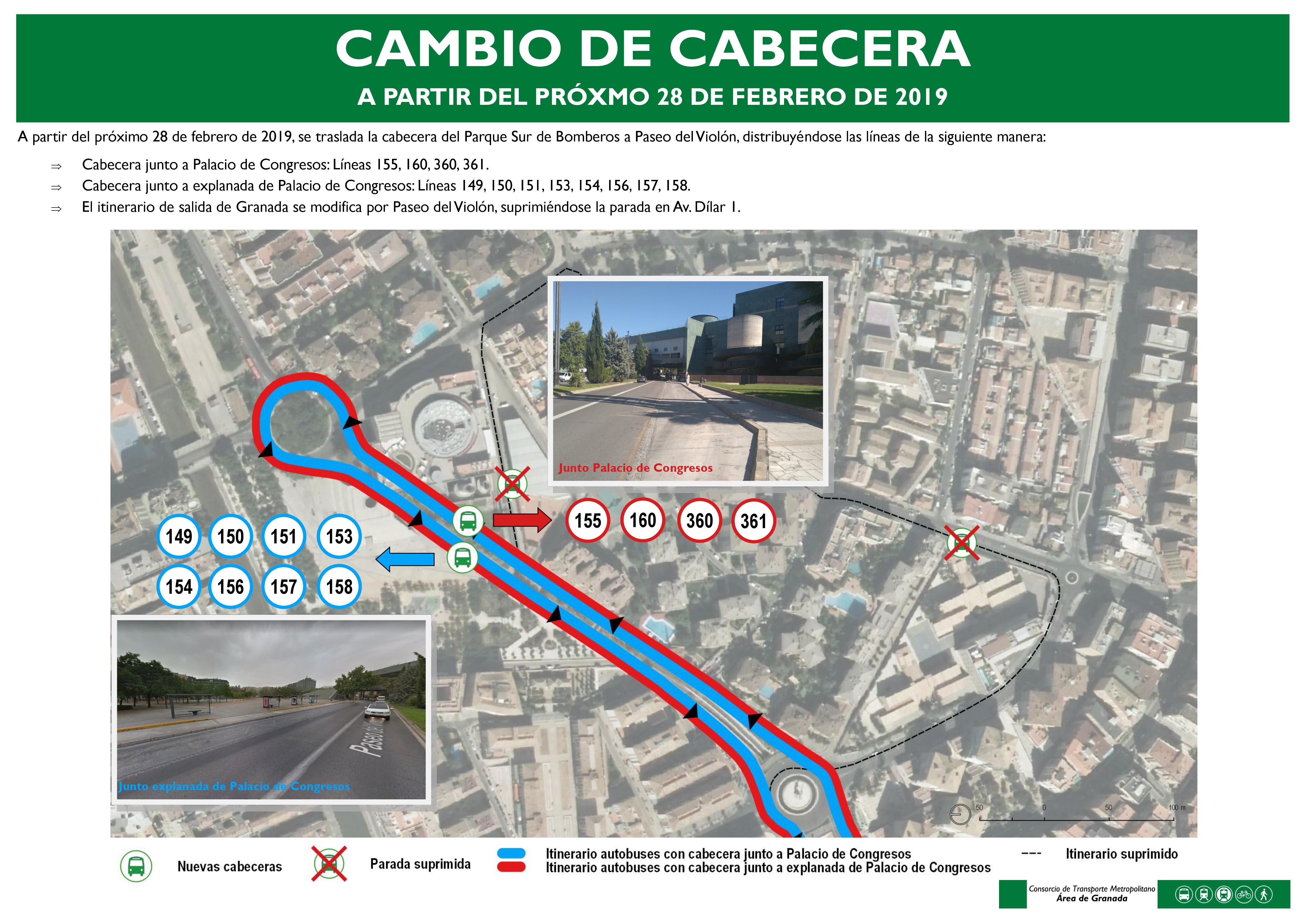 Una docena de líneas del Área Metropolitana de Granada cambian este jueves 28 de febrero la cabecera de salida y llegada que actualmente tenían en el Parque de Bomberos Sur de la capital para trasladarse al Paseo del Violón junto explanada del Palacio de Congresos.
