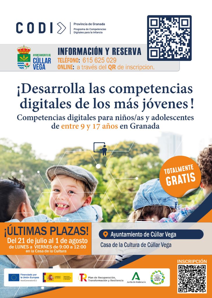 El Ayuntamiento de Cúllar Vega abre las últimas plazas para participar en el Programa de Competencias Digitales para niños/as y adolescentes (CODI), dirigido a edades comprendidas entre los 9 y los 17 años.