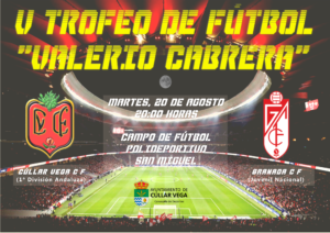 El próximo martes, 20 de Agosto, se disputará la V Edición del Trofeo de Fútbol “Valerio Cabrera” en el Polideportivo Municipal San Miguel de Cúllar Vega a partir de las 21h donde tendrá lugar la presentación del Cúllar Vega C.F. para la temporada 2019-2020.