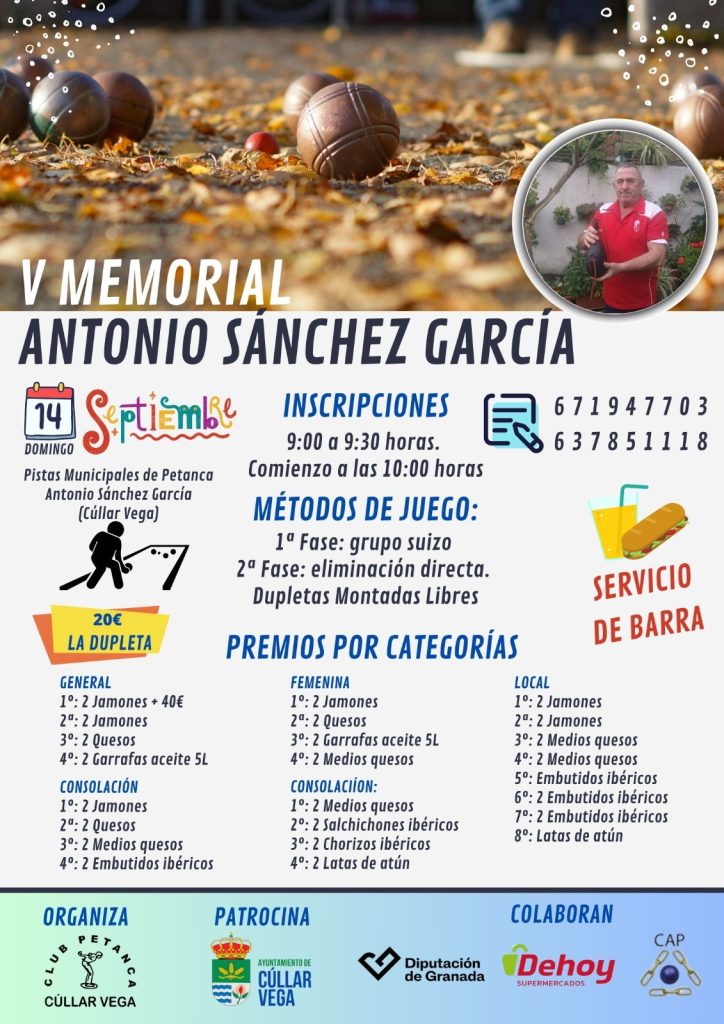 El domingo 14 de septiembre se celebrará el V Memorial Antonio Sánchez García en las Pistas Municipales de Petanca Antonio Sánchez García en Cúllar Vega.