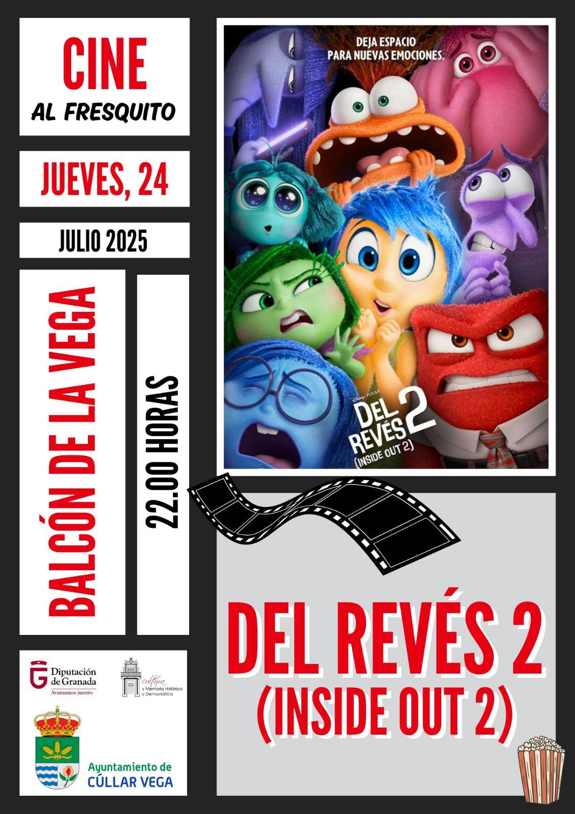 A continuación, a partir de las 22:00 h, tendrá lugar la proyección de la película “Del Revés 2” dentro del ciclo Cine al Fresquito, una cita clásica del verano que permite disfrutar del mejor cine de animación al aire libre. Esta actividad forma parte del Programa de Concertación con la Diputación de Granada