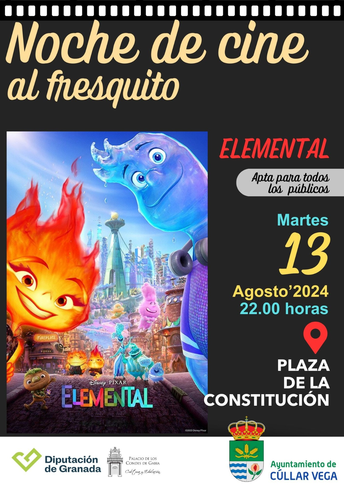El martes 13 a las 22 h. ¡CINE AL FRESQUITO! con la película “ELEMENTAL” en la Plaza de La Constitución. «Programa de Concertación Local 2024 entre Diputación de Granada y Ayto de Cúllar Vega»
