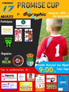 El próximo domingo, 17 de marzo, el Estadio Municipal San Miguel albergará la «VI Edición del Torneo de fútbol 7 Promise Cup» a partir de las 9h. En este torneo, organizado conjuntamente entre el C.D. Cúllar Vega Base y la Concejalía de Deportes, se darán cita los más jóvenes participantes de este deporte mediante sus diferentes equipos, siendo por lo tanto las categorías «Bebé y Pre-benjamín» las establecidas para la ocasión.