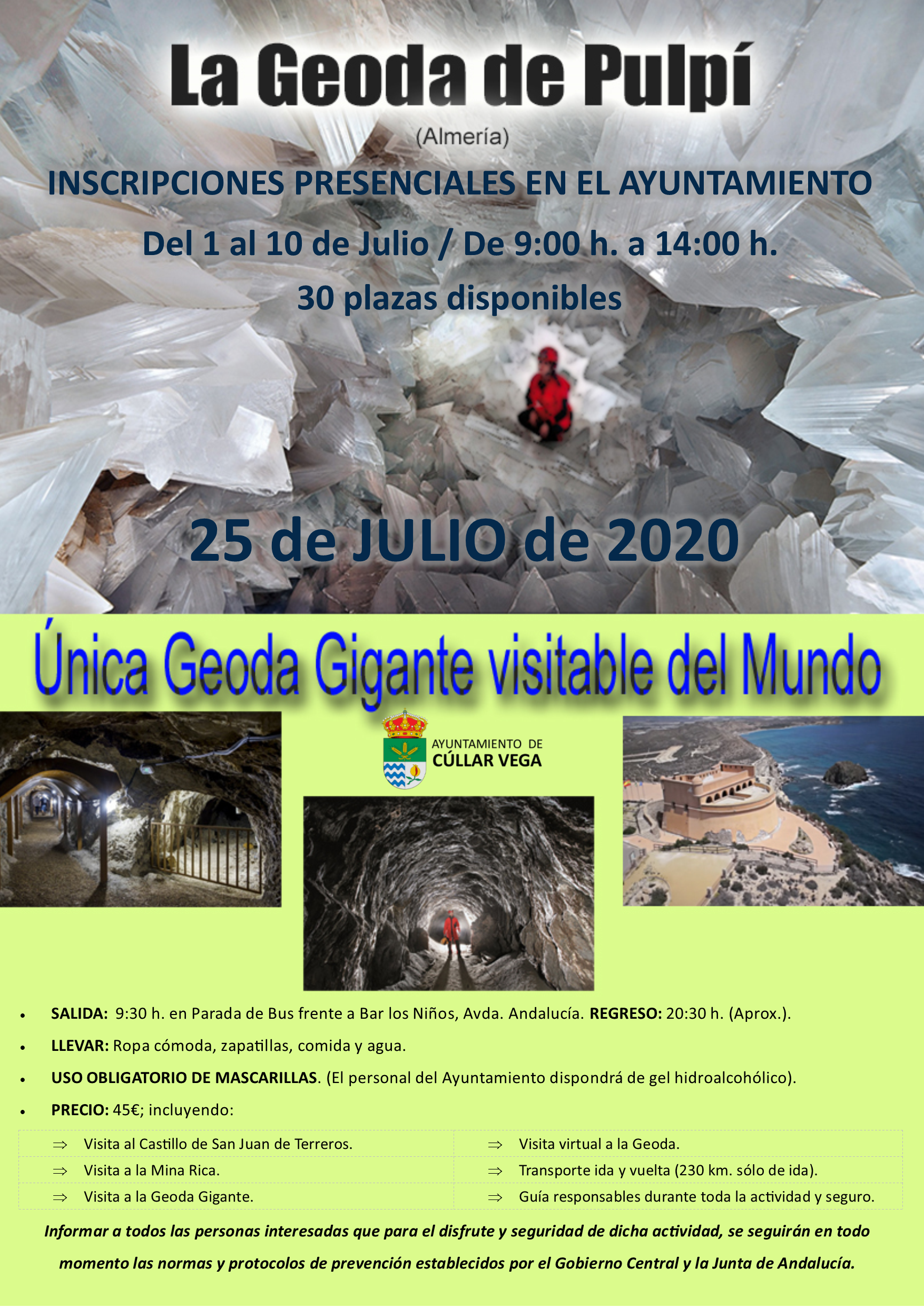 – Precio: 45 € incluyendo Visita al Castillo de San Juan de Terreros, Visita a la Mina Rica, Visita a la Geoda Gigante, Visita Virtual a la Geoda, Transporte de Ida y Vuelta (230 km sólo de ida), guías responsables durante toda la actividad y seguro.