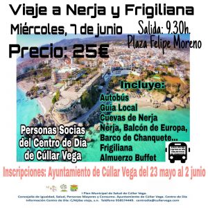 La Concejalía de Personas Mayores organiza un viaje a Nerja y Frigiliana para el próximo día 7 de Junio dirigido a las personas socias del Centro de Día
