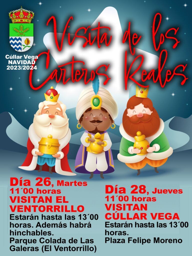 El martes 26 a las 11:00 horas estarán los Carteros Reales en El Ventorrillo para atender las peticiones de tod@s l@s niñ@s y recoger sus cartas que entregarán a sus Majestades Los Reyes Magos de Oriente. Estarán hasta las 13’00 horas en el Parque Colada de Las Galeras (El Ventorrillo) donde además habrá hinchables.